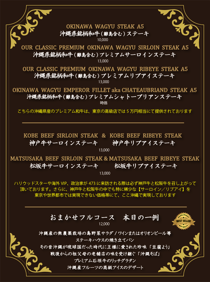 | 電話番号 | 098-988-9925 info@steakhouse473.com |