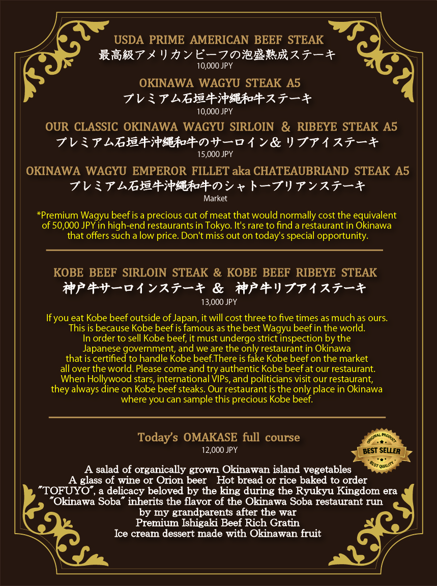 저희 가게는, 이 귀중한 오키나와의 술을 사용한 “오키나와의 술 숙성 스테이크”의 발상점입니다 (세계 최초) 저희 가게에서 밖에 먹을 수 없는 오리지날 스테이크를 제공합니다.