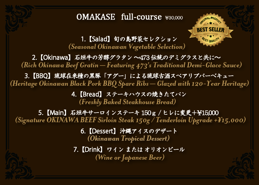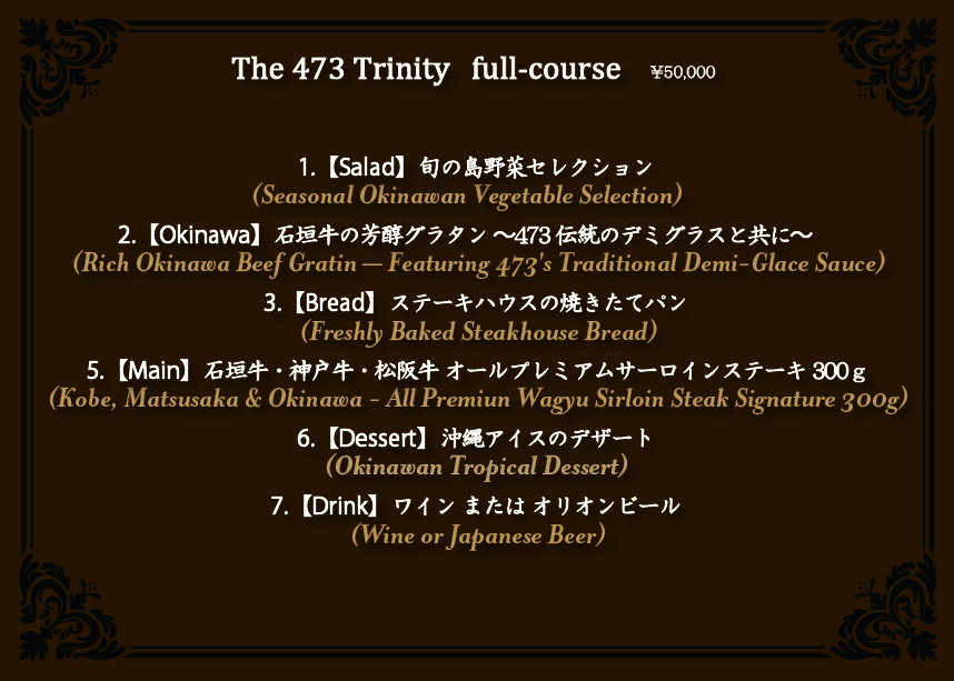 The 473 Trinity: The Decisive Gathering of Three Legends. Kobe, Matsusaka, and Okinawa—the three supreme lineages of Japanese Wagyu. OKINAWA ORIGINAL STEAK HOUSE 473 is the only establishment in Japan where these three “Kings of Beef” converge in a single dining experience. “The 473 Trinity” is a signature full-course featuring a total of 300g of premium sirloin from all three brands—an unprecedented volume in the world of high-end dining. This convergence of Wagyu at its pinnacle is the ultimate testament to the trust earned by 473. Indulge in a journey that begins with our heritage demi-glace and culminates in a 300g steak masterpiece. Experience the pride of Japan and the unwavering credibility of 473, a destination for those who seek the truly authentic. 日本が世界に誇る三大銘柄牛、「石垣牛」「神戸牛」「松阪牛」。 この三つの頂点が一点に集結するレストランは、日本国内において473をおいて他にはなく、この集結が473の信頼の証です。その三大銘柄のプレミアムサーロインを合計300gというボリュームで供する特別なフルコースです。妥協を許さない本物の品質を、心ゆくまでご堪能ください。