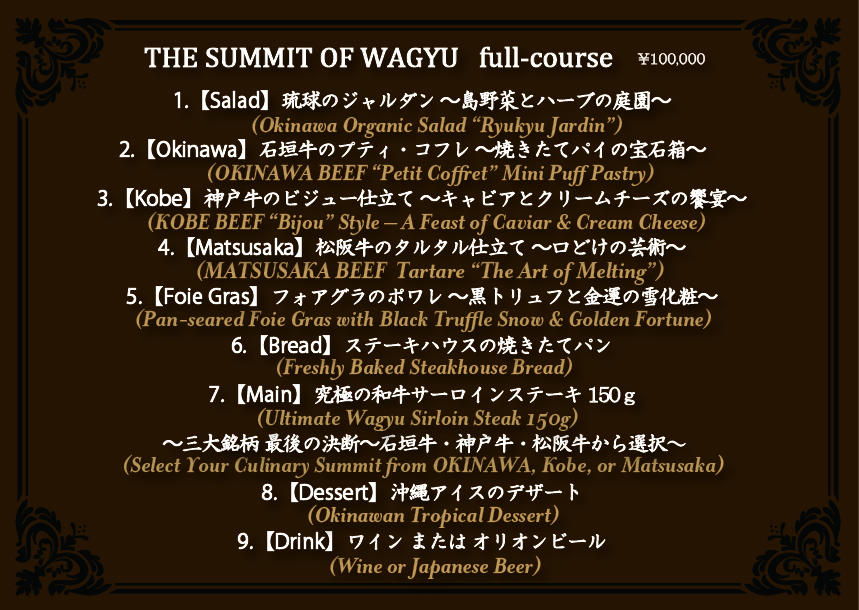 THE SUMMIT OF WAGYU: In addition to Japan’s three crowning Wagyu lineages (Kobe, Matsusaka, and Okinawa), this course features a magnificent feast of the world’s three most prestigious delicacies: Caviar, Foie Gras, and Black Truffle. A supreme culinary symphony where the pinnacle of Wagyu meets the world’s ultimate treasures. This full-course experience, bringing together all these rare jewels in a single evening, is truly worthy of the name “THE SUMMIT.” We promise you a once-in-a-lifetime journey of unparalleled luxury. 私たち地元沖縄が誇る石垣牛と、日本三大和牛の神戸牛・松阪牛に加え、世界の三大高級食材である「キャビア」「フォアグラ」「黒トリュフ」が贅沢に饗宴。 至高の和牛と世界を魅了する三大珍味が織りなす究極の美食体験。全ての至宝が一堂に会するフルコースです。
